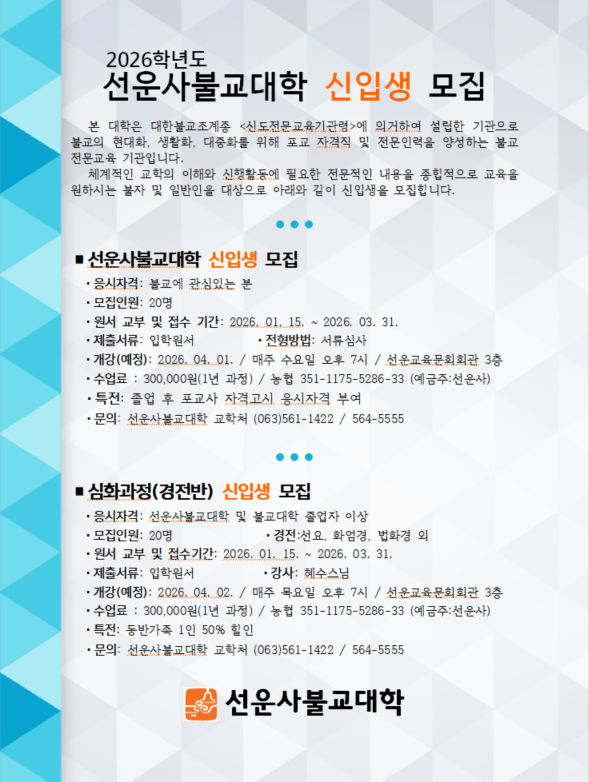 2026년도 선운사 불교대학 신입생과 심화과정(경전반) 신입생 모집!!!